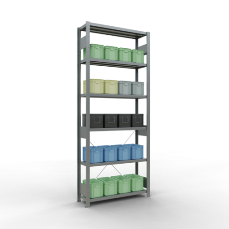 Schwerlastregal vom Markenhersteller SCHULTE Lagertechnik. Das Schwerlastregal vom Typ MULTIplus ist das wohl bekannteste Steckregal auf dem deutschen Markt und wird oftmals, in Lagern, an Produktionslinien, in Archiven, oder auch in privaten Haushalten verwendet. Das hier angebotene Schwerlastregal Grundregal mit der Artikelnummer 13931 wird in 2500 mm Höhe, 1000 mm Breite und 300 mm Tiefe geliefert. Es ist mit 6 Fachebenen ausgestattet und kann je Ebene mit 330 kg belastet werden. Um die langfristige Nutzung zu gewährleisten sind die Bauteile in der Farbe verzinkt. Das Schwerlastregal ist für die Einseitige Bedienung ausgelegt.