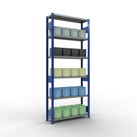 Schwerlastregal vom Markenhersteller SCHULTE Lagertechnik. Das Schwerlastregal vom Typ MULTIplus ist das wohl bekannteste Steckregal auf dem deutschen Markt und wird oftmals, in Lagern, an Produktionslinien, in Archiven, oder auch in privaten Haushalten verwendet. Das hier angebotene Schwerlastregal Grundregal mit der Artikelnummer 13931-LR-B wird in 2500 mm Höhe, 1000 mm Breite und 300 mm Tiefe geliefert. Es ist mit 6 Fachebenen ausgestattet und kann je Ebene mit 330 kg belastet werden. Um die langfristige Nutzung zu gewährleisten sind die Bauteile in der Farbe RAL 5010 enzianblau/verzinkt. Das Schwerlastregal ist für die Beidseitige Bedienung ausgelegt.