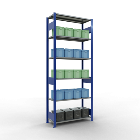 Schwerlastregal vom Markenhersteller SCHULTE Lagertechnik. Das Schwerlastregal vom Typ MULTIplus ist das wohl bekannteste Steckregal auf dem deutschen Markt und wird oftmals, in Lagern, an Produktionslinien, in Archiven, oder auch in privaten Haushalten verwendet. Das hier angebotene Schwerlastregal Grundregal mit der Artikelnummer 12741-LR-B-M wird in 2500 mm Höhe, 1000 mm Breite und 400 mm Tiefe geliefert. Es ist mit 6 Fachebenen ausgestattet und kann je Ebene mit 150 kg belastet werden. Um die langfristige Nutzung zu gewährleisten sind die Bauteile in der Farbe RAL 5010 enzianblau/verzinkt. Das Schwerlastregal ist für die Beidseitige Bedienung ausgelegt.