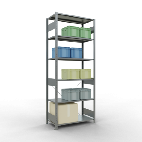 Die einzelnen Fachböden können im Raster von 25 mm in der Höhe verstellt werden. Sollte die angegebene, gleichmäßig verteilte Fachlast i.H.v. 150 kg je Fach nicht ausreichen, können Sie die Fachböden mit Verstärkungsunterzügen ausstatten und so die Tragkraft erhöhen. Bitte beachten Sie dabei allerdings die maximal zulässige Feldlast.