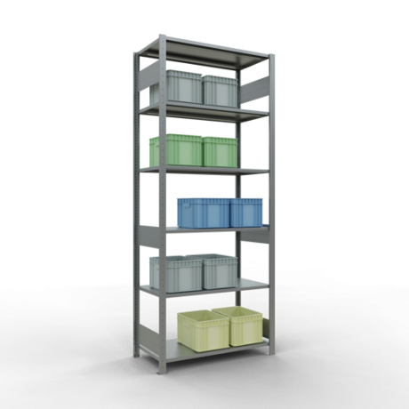 Die einzelnen Fachböden können im Raster von 25 mm in der Höhe verstellt werden. Sollte die angegebene, gleichmäßig verteilte Fachlast i.H.v. 85 kg je Fach nicht ausreichen, können Sie die Fachböden mit Verstärkungsunterzügen ausstatten und so die Tragkraft erhöhen. Bitte beachten Sie dabei allerdings die maximal zulässige Feldlast.