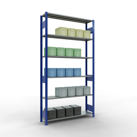 Schwerlastregal vom Markenhersteller SCHULTE Lagertechnik. Das Schwerlastregal vom Typ MULTIplus ist das wohl bekannteste Steckregal auf dem deutschen Markt und wird oftmals, in Lagern, an Produktionslinien, in Archiven, oder auch in privaten Haushalten verwendet. Das hier angebotene Schwerlastregal Grundregal mit der Artikelnummer 12731-130-LR-B wird in 2500 mm Höhe, 1300 mm Breite und 300 mm Tiefe geliefert. Es ist mit 6 Fachebenen ausgestattet und kann je Ebene mit 150 kg belastet werden. Um die langfristige Nutzung zu gewährleisten sind die Bauteile in der Farbe RAL 5010 enzianblau/verzinkt. Das Schwerlastregal ist für die Beidseitige Bedienung ausgelegt.