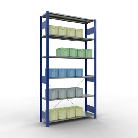 Schwerlastregal vom Markenhersteller SCHULTE Lagertechnik. Das Schwerlastregal vom Typ MULTIplus ist das wohl bekannteste Steckregal auf dem deutschen Markt und wird oftmals, in Lagern, an Produktionslinien, in Archiven, oder auch in privaten Haushalten verwendet. Das hier angebotene Schwerlastregal Grundregal mit der Artikelnummer 12741-130-B-M wird in 2500 mm Höhe, 1300 mm Breite und 400 mm Tiefe geliefert. Es ist mit 6 Fachebenen ausgestattet und kann je Ebene mit 150 kg belastet werden. Um die langfristige Nutzung zu gewährleisten sind die Bauteile in der Farbe RAL 5010 enzianblau/verzinkt. Das Schwerlastregal ist für die Einseitige Bedienung ausgelegt.