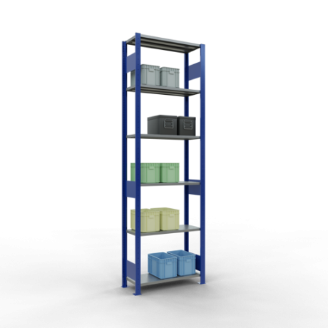 Schwerlastregal vom Markenhersteller SCHULTE Lagertechnik. Das Schwerlastregal vom Typ MULTIplus ist das wohl bekannteste Steckregal auf dem deutschen Markt und wird oftmals, in Lagern, an Produktionslinien, in Archiven, oder auch in privaten Haushalten verwendet. Das hier angebotene Schwerlastregal Grundregal mit der Artikelnummer 12731-75-LR-B wird in 2500 mm Höhe, 750 mm Breite und 300 mm Tiefe geliefert. Es ist mit 6 Fachebenen ausgestattet und kann je Ebene mit 150 kg belastet werden. Um die langfristige Nutzung zu gewährleisten sind die Bauteile in der Farbe RAL 5010 enzianblau/verzinkt. Das Schwerlastregal ist für die Beidseitige Bedienung ausgelegt.