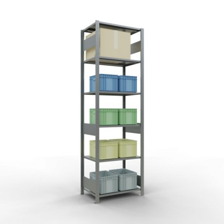 Die einzelnen Fachböden können im Raster von 25 mm in der Höhe verstellt werden. Sollte die angegebene, gleichmäßig verteilte Fachlast i.H.v. 150 kg je Fach nicht ausreichen, können Sie die Fachböden mit Verstärkungsunterzügen ausstatten und so die Tragkraft erhöhen. Bitte beachten Sie dabei allerdings die maximal zulässige Feldlast.