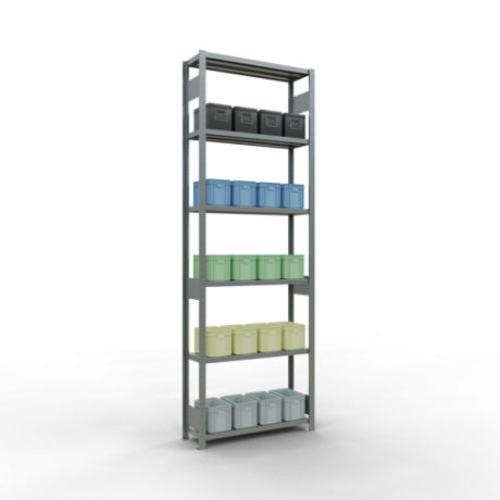 Die einzelnen Fachböden können im Raster von 25 mm in der Höhe verstellt werden. Sollte die angegebene, gleichmäßig verteilte Fachlast i.H.v. 250 kg je Fach nicht ausreichen, können Sie die Fachböden mit Verstärkungsunterzügen ausstatten und so die Tragkraft erhöhen. Bitte beachten Sie dabei allerdings die maximal zulässige Feldlast.