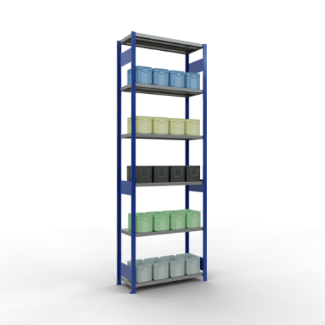 Schwerlastregal vom Markenhersteller SCHULTE Lagertechnik. Das Schwerlastregal vom Typ MULTIplus ist das wohl bekannteste Steckregal auf dem deutschen Markt und wird oftmals, in Lagern, an Produktionslinien, in Archiven, oder auch in privaten Haushalten verwendet. Das hier angebotene Schwerlastregal Grundregal mit der Artikelnummer 12942-LR-B wird in 3000 mm Höhe, 1000 mm Breite und 400 mm Tiefe geliefert. Es ist mit 7 Fachebenen ausgestattet und kann je Ebene mit 250 kg belastet werden. Um die langfristige Nutzung zu gewährleisten sind die Bauteile in der Farbe RAL 5010 enzianblau/verzinkt. Das Schwerlastregal ist für die Beidseitige Bedienung ausgelegt.