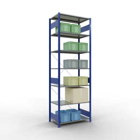 Schwerlastregal vom Markenhersteller SCHULTE Lagertechnik. Das Schwerlastregal vom Typ MULTIplus ist das wohl bekannteste Steckregal auf dem deutschen Markt und wird oftmals, in Lagern, an Produktionslinien, in Archiven, oder auch in privaten Haushalten verwendet. Das hier angebotene Schwerlastregal Grundregal mit der Artikelnummer 12762-B wird in 3000 mm Höhe, 1000 mm Breite und 600 mm Tiefe geliefert. Es ist mit 7 Fachebenen ausgestattet und kann je Ebene mit 150 kg belastet werden. Um die langfristige Nutzung zu gewährleisten sind die Bauteile in der Farbe RAL 5010 enzianblau/verzinkt. Das Schwerlastregal ist für die Einseitige Bedienung ausgelegt.