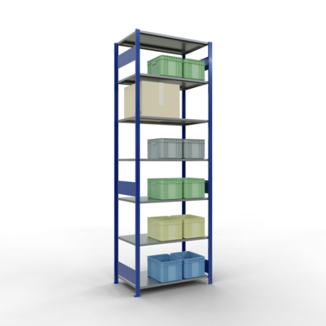 Schwerlastregal vom Markenhersteller SCHULTE Lagertechnik. Das Schwerlastregal vom Typ MULTIplus ist das wohl bekannteste Steckregal auf dem deutschen Markt und wird oftmals, in Lagern, an Produktionslinien, in Archiven, oder auch in privaten Haushalten verwendet. Das hier angebotene Schwerlastregal Grundregal mit der Artikelnummer 12762-LR-B wird in 3000 mm Höhe, 1000 mm Breite und 600 mm Tiefe geliefert. Es ist mit 7 Fachebenen ausgestattet und kann je Ebene mit 150 kg belastet werden. Um die langfristige Nutzung zu gewährleisten sind die Bauteile in der Farbe RAL 5010 enzianblau/verzinkt. Das Schwerlastregal ist für die Beidseitige Bedienung ausgelegt.