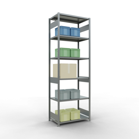 Die einzelnen Fachböden können im Raster von 25 mm in der Höhe verstellt werden. Sollte die angegebene, gleichmäßig verteilte Fachlast i.H.v. 250 kg je Fach nicht ausreichen, können Sie die Fachböden mit Verstärkungsunterzügen ausstatten und so die Tragkraft erhöhen. Bitte beachten Sie dabei allerdings die maximal zulässige Feldlast.