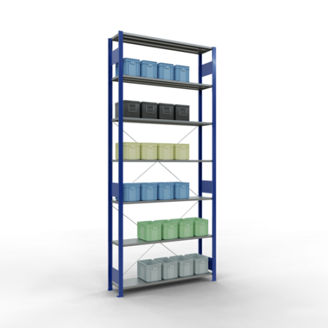 Schwerlastregal vom Markenhersteller SCHULTE Lagertechnik. Das Schwerlastregal vom Typ MULTIplus ist das wohl bekannteste Steckregal auf dem deutschen Markt und wird oftmals, in Lagern, an Produktionslinien, in Archiven, oder auch in privaten Haushalten verwendet. Das hier angebotene Schwerlastregal Grundregal mit der Artikelnummer 12732-130-B wird in 3000 mm Höhe, 1300 mm Breite und 300 mm Tiefe geliefert. Es ist mit 7 Fachebenen ausgestattet und kann je Ebene mit 150 kg belastet werden. Um die langfristige Nutzung zu gewährleisten sind die Bauteile in der Farbe RAL 5010 enzianblau/verzinkt. Das Schwerlastregal ist für die Einseitige Bedienung ausgelegt.