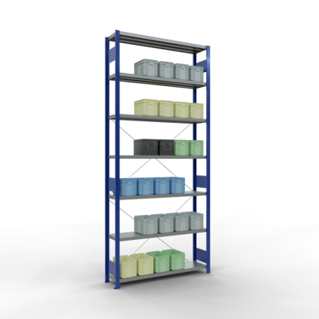 Schwerlastregal vom Markenhersteller SCHULTE Lagertechnik. Das Schwerlastregal vom Typ MULTIplus ist das wohl bekannteste Steckregal auf dem deutschen Markt und wird oftmals, in Lagern, an Produktionslinien, in Archiven, oder auch in privaten Haushalten verwendet. Das hier angebotene Schwerlastregal Grundregal mit der Artikelnummer 12932-130-B wird in 3000 mm Höhe, 1300 mm Breite und 300 mm Tiefe geliefert. Es ist mit 7 Fachebenen ausgestattet und kann je Ebene mit 250 kg belastet werden. Um die langfristige Nutzung zu gewährleisten sind die Bauteile in der Farbe RAL 5010 enzianblau/verzinkt. Das Schwerlastregal ist für die Einseitige Bedienung ausgelegt.