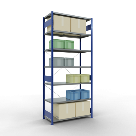 Schwerlastregal vom Markenhersteller SCHULTE Lagertechnik. Das Schwerlastregal vom Typ MULTIplus ist das wohl bekannteste Steckregal auf dem deutschen Markt und wird oftmals, in Lagern, an Produktionslinien, in Archiven, oder auch in privaten Haushalten verwendet. Das hier angebotene Schwerlastregal Grundregal mit der Artikelnummer 12962-130-B wird in 3000 mm Höhe, 1300 mm Breite und 600 mm Tiefe geliefert. Es ist mit 7 Fachebenen ausgestattet und kann je Ebene mit 250 kg belastet werden. Um die langfristige Nutzung zu gewährleisten sind die Bauteile in der Farbe RAL 5010 enzianblau/verzinkt. Das Schwerlastregal ist für die Einseitige Bedienung ausgelegt.