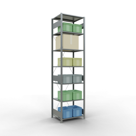 Die einzelnen Fachböden können im Raster von 25 mm in der Höhe verstellt werden. Sollte die angegebene, gleichmäßig verteilte Fachlast i.H.v. 150 kg je Fach nicht ausreichen, können Sie die Fachböden mit Verstärkungsunterzügen ausstatten und so die Tragkraft erhöhen. Bitte beachten Sie dabei allerdings die maximal zulässige Feldlast.