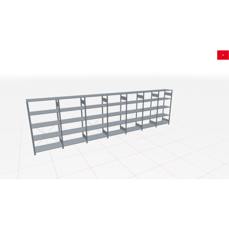 Schwerlastregal des Herstellers SCHULTE Lagertechnik in den Abmessungen 2.000x9100x500 mm (HxBxT). Es wird in der Farbe verzinkt geliefert und besteht aus 1 Grundregal in 1.300 mm Breite und 6 Anbauregal(-en) in 1.300 mm Breite. Jede der 5 Fachebenen kann mit bis zu 250 kg belastet werden. Das Schwerlastregal ist für die einseitige Bedienung ausgelegt und wird daher mit sogenannten Kreuzstreben ausgesteift. Die Schwerlastregal Fachebenen können im Raster von 25 mm in der Höhe verstellt werden. Die Lagerfläche auf den Fachböden beträgt insgesamt 22,75 m².