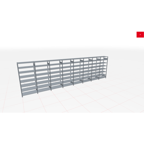 Schwerlastregal des Herstellers SCHULTE Lagertechnik in den Abmessungen 2.000x10400x300 mm (HxBxT). Es wird in der Farbe verzinkt geliefert und besteht aus 1 Grundregal in 1.300 mm Breite und 7 Anbauregal(-en) in 1.300 mm Breite. Jede der 8 Fachebenen kann mit bis zu 250 kg belastet werden. Das Schwerlastregal ist für die einseitige Bedienung ausgelegt und wird daher mit sogenannten Kreuzstreben ausgesteift. Die Schwerlastregal Fachebenen können im Raster von 25 mm in der Höhe verstellt werden. Die Lagerfläche auf den Fachböden beträgt insgesamt 24,96 m².