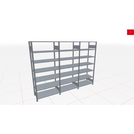 Schwerlastregal des Herstellers SCHULTE Lagertechnik in den Abmessungen 2.300x3900x400 mm (HxBxT). Es wird in der Farbe verzinkt geliefert und besteht aus 1 Grundregal in 1.300 mm Breite und 2 Anbauregal(-en) in 1.300 mm Breite. Jede der 7 Fachebenen kann mit bis zu 250 kg belastet werden. Das Schwerlastregal ist für die einseitige Bedienung ausgelegt und wird daher mit sogenannten Kreuzstreben ausgesteift. Die Schwerlastregal Fachebenen können im Raster von 25 mm in der Höhe verstellt werden. Die Lagerfläche auf den Fachböden beträgt insgesamt 10,92 m².
