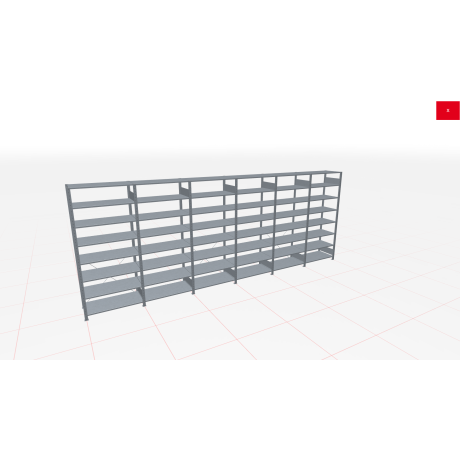 Schwerlastregal des Herstellers SCHULTE Lagertechnik in den Abmessungen 2.500x7800x400 mm (HxBxT). Es wird in der Farbe verzinkt geliefert und besteht aus 1 Grundregal in 1.300 mm Breite und 5 Anbauregal(-en) in 1.300 mm Breite. Jede der 8 Fachebenen kann mit bis zu 250 kg belastet werden. Das Schwerlastregal ist für die einseitige Bedienung ausgelegt und wird daher mit sogenannten Kreuzstreben ausgesteift. Die Schwerlastregal Fachebenen können im Raster von 25 mm in der Höhe verstellt werden. Die Lagerfläche auf den Fachböden beträgt insgesamt 24,96 m².