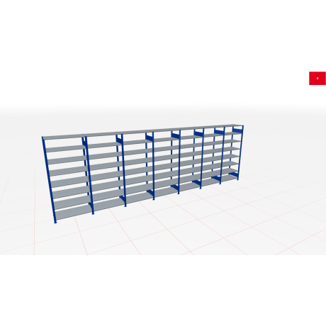 Schwerlastregal des Herstellers SCHULTE Lagertechnik in den Abmessungen 2,500x7000x600 mm (HxBxT). Es wird in der Farbe RAL 5010 enzianblau / verzinkt geliefert und besteht aus 1 Grundregal in 1,000 mm Breite und 6 Anbauregal(-en) in 1,000 mm Breite. Jede der 8 Fachebenen kann mit bis zu 250 kg belastet werden. Das Schwerlastregal ist für die Beidseitige Bedienung ausgelegt und wird mit Längenriegel ausgesteift. Die Schwerlastregal Fachebenen können im Raster von 25 mm in der Höhe verstellt werden. Die Lagerfläche auf den Fachböden beträgt insgesamt 33.6 m².