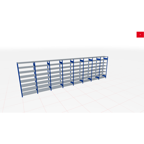Schwerlastregal des Herstellers SCHULTE Lagertechnik in den Abmessungen 2,500x8000x300 mm (HxBxT). Es wird in der Farbe RAL 5010 enzianblau / verzinkt geliefert und besteht aus 1 Grundregal in 1,000 mm Breite und 7 Anbauregal(-en) in 1,000 mm Breite. Jede der 8 Fachebenen kann mit bis zu 250 kg belastet werden. Das Schwerlastregal ist für die Beidseitige Bedienung ausgelegt und wird mit Längenriegel ausgesteift. Die Schwerlastregal Fachebenen können im Raster von 25 mm in der Höhe verstellt werden. Die Lagerfläche auf den Fachböden beträgt insgesamt 19.2 m².