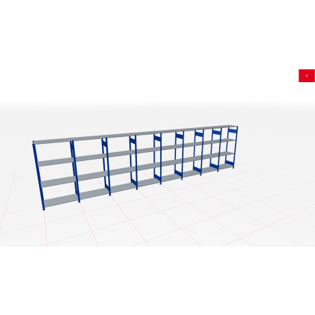 Schwerlastregal des Herstellers SCHULTE Lagertechnik in den Abmessungen 2,500x8000x600 mm (HxBxT). Es wird in der Farbe RAL 5010 enzianblau / verzinkt geliefert und besteht aus 1 Grundregal in 1,000 mm Breite und 7 Anbauregal(-en) in 1,000 mm Breite. Jede der 4 Fachebenen kann mit bis zu 250 kg belastet werden. Das Schwerlastregal ist für die Beidseitige Bedienung ausgelegt und wird mit Längenriegel ausgesteift. Die Schwerlastregal Fachebenen können im Raster von 25 mm in der Höhe verstellt werden. Die Lagerfläche auf den Fachböden beträgt insgesamt 19.2 m².