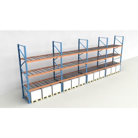 Das Palettenregal von NEDCON Lagertechnik hat Abmessungen von 2.500x11300x1.100 mm (HxBxT) und verfügt über 4 Lagerebenen. Jedes Regalfeld ist mit 3 Traversenebenen ausgestattet und kann je Ebene mit bis zu 3.000 kg (1000 kg je Europalette) belastet werden. Die maximale Feldlast beträgt 12.000 kg und darf niemals überschritten werden. Die lichte Fachhöhe zwischen den einzelnen Ebenen beträgt 500 mm. Die Palettenregal Traversenebenen sind mit Gitterböden vom Typ MantaMESH in der 750 kg Variante (je Palettenplatz) ausgestattet.