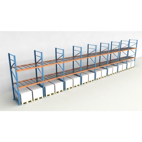 Das Palettenregal von NEDCON Lagertechnik hat Abmessungen von 2.500x15500x1.100 mm (HxBxT) und verfügt über 3 Lagerebenen. Jedes Regalfeld ist mit 2 Traversenebenen ausgestattet und kann je Ebene mit bis zu 3.800 kg (1900 kg je Europalette) belastet werden. Die maximale Feldlast beträgt 12.000 kg und darf niemals überschritten werden. Die lichte Fachhöhe zwischen den einzelnen Ebenen beträgt 750 mm. Die Palettenregal Traversenebenen sind mit Gitterböden vom Typ MantaMESH in der 750 kg Variante (je Palettenplatz) ausgestattet.