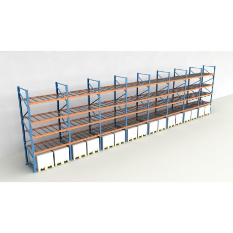 Das Palettenregal von NEDCON Lagertechnik hat Abmessungen von 2.500x15500x1.100 mm (HxBxT) und verfügt über 5 Lagerebenen. Jedes Regalfeld ist mit 4 Traversenebenen ausgestattet und kann je Ebene mit bis zu 3.800 kg (1900 kg je Europalette) belastet werden. Die maximale Feldlast beträgt 12.000 kg und darf niemals überschritten werden. Die lichte Fachhöhe zwischen den einzelnen Ebenen beträgt 400 mm. Die Palettenregal Traversenebenen sind mit Gitterböden vom Typ MantaMESH in der 750 kg Variante (je Palettenplatz) ausgestattet.