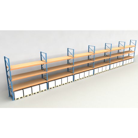 Das Palettenregal von NEDCON Lagertechnik hat Abmessungen von 2.500x22300x1.100 mm (HxBxT) und verfügt über 4 Lagerebenen. Jedes Regalfeld ist mit 3 Traversenebenen ausgestattet und kann je Ebene mit bis zu 4.700 kg (1175 kg je Europalette) belastet werden. Die maximale Feldlast beträgt 12.000 kg und darf niemals überschritten werden. Die lichte Fachhöhe zwischen den einzelnen Ebenen beträgt 500 mm. Die Palettenregal Traversenebenen sind mit Spanplatten vom Typ P4 in 38 mm Stärke ausgestattet.