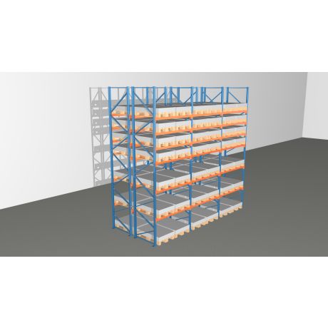Das Palettenregal besteht aus insgesamt 2x3 Regalfeldern mit einer Breite von 1.825 mm und bietet Platz für 84 Europaletten (inklusive Bodenebene). Der Abstand zwischen beiden Regalzeilen beträgt 200 mm.