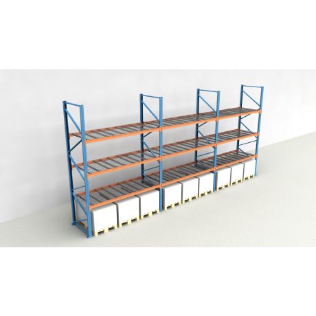 Das Palettenregal von NEDCON Lagertechnik hat Abmessungen von 2.500x8500x1.100 mm (HxBxT) und verfügt über 4 Lagerebenen. Jedes Regalfeld ist mit 3 Traversenebenen ausgestattet und kann je Ebene mit bis zu 3.000 kg (1000 kg je Europalette) belastet werden. Die maximale Feldlast beträgt 12.000 kg und darf niemals überschritten werden. Die lichte Fachhöhe zwischen den einzelnen Ebenen beträgt 500 mm. Die Palettenregal Traversenebenen sind mit Gitterböden vom Typ MantaMESH in der 750 kg Variante (je Palettenplatz) ausgestattet.