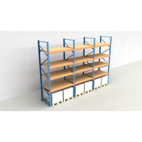 Das Palettenregal besteht aus insgesamt 3 Regalfeldern mit einer Breite von 1.825 mm und bietet Platz für 30 Europaletten (inklusive Bodenebene).