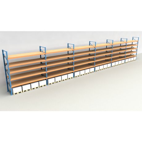 Das Palettenregal von NEDCON Lagertechnik hat Abmessungen von 3.500x22300x1.100 mm (HxBxT) und verfügt über 6 Lagerebenen. Jedes Regalfeld ist mit 5 Traversenebenen ausgestattet und kann je Ebene mit bis zu 4.700 kg (1175 kg je Europalette) belastet werden. Die maximale Feldlast beträgt 12.000 kg und darf niemals überschritten werden. Die lichte Fachhöhe zwischen den einzelnen Ebenen beträgt 450 mm. Die Palettenregal Traversenebenen sind mit Spanplatten vom Typ P4 in 38 mm Stärke ausgestattet.