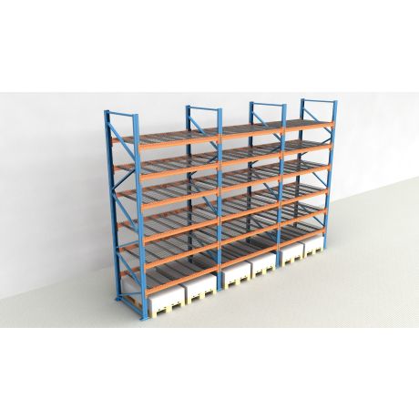Das Palettenregal von NEDCON Lagertechnik hat Abmessungen von 3.500x5875x1.100 mm (HxBxT) und verfügt über 7 Lagerebenen. Jedes Regalfeld ist mit 6 Traversenebenen ausgestattet und kann je Ebene mit bis zu 3.000 kg (1500 kg je Europalette) belastet werden. Die maximale Feldlast beträgt 12.000 kg und darf niemals überschritten werden. Die lichte Fachhöhe zwischen den einzelnen Ebenen beträgt 400 mm. Die Palettenregal Traversenebenen sind mit Gitterböden vom Typ MantaMESH in der 750 kg Variante (je Palettenplatz) ausgestattet.