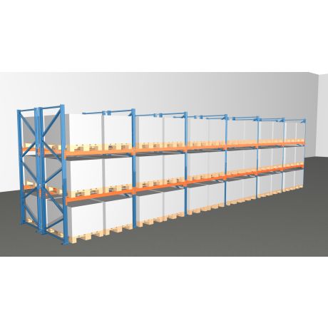 Das Palettenregal besteht aus insgesamt 2x6 Regalfeldern mit einer Breite von 1.825 mm und bietet Platz für 72 Europaletten (inklusive Bodenebene). Der Abstand zwischen beiden Regalzeilen beträgt 200 mm.