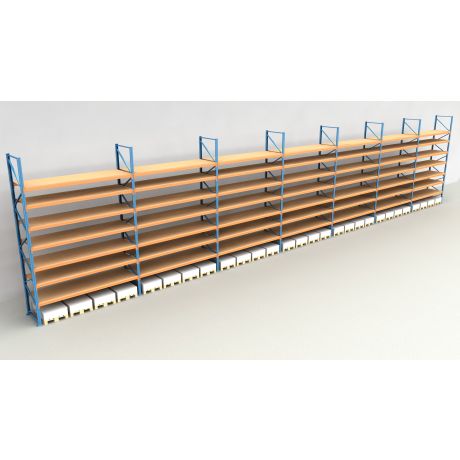Das Palettenregal von NEDCON Lagertechnik hat Abmessungen von 4.500x26000x1.100 mm (HxBxT) und verfügt über 8 Lagerebenen. Jedes Regalfeld ist mit 7 Traversenebenen ausgestattet und kann je Ebene mit bis zu 4.700 kg (1175 kg je Europalette) belastet werden. Die maximale Feldlast beträgt 12.000 kg und darf niemals überschritten werden. Die lichte Fachhöhe zwischen den einzelnen Ebenen beträgt 450 mm. Die Palettenregal Traversenebenen sind mit Spanplatten vom Typ P4 in 38 mm Stärke ausgestattet.