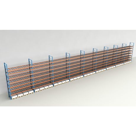 Das Palettenregal von NEDCON Lagertechnik hat Abmessungen von 4.500x33400x1.100 mm (HxBxT) und verfügt über 8 Lagerebenen. Jedes Regalfeld ist mit 7 Traversenebenen ausgestattet und kann je Ebene mit bis zu 3.000 kg (750 kg je Europalette) belastet werden. Die maximale Feldlast beträgt 12.000 kg und darf niemals überschritten werden. Die lichte Fachhöhe zwischen den einzelnen Ebenen beträgt 450 mm. Die Palettenregal Traversenebenen sind mit Gitterböden vom Typ MantaMESH in der 750 kg Variante (je Palettenplatz) ausgestattet.