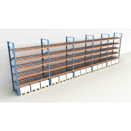 Das Palettenregal von NEDCON Lagertechnik hat Abmessungen von 5.000x14100x1.100 mm (HxBxT) und verfügt über 6 Lagerebenen. Jedes Regalfeld ist mit 5 Traversenebenen ausgestattet und kann je Ebene mit bis zu 3.000 kg (1000 kg je Europalette) belastet werden. Die maximale Feldlast beträgt 12.000 kg und darf niemals überschritten werden. Die lichte Fachhöhe zwischen den einzelnen Ebenen beträgt 700 mm. Die Palettenregal Traversenebenen sind mit Gitterböden vom Typ MantaMESH in der 750 kg Variante (je Palettenplatz) ausgestattet.