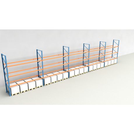 Das Palettenregal von NEDCON Lagertechnik hat Abmessungen von 5.000x18600x1.100 mm (HxBxT) und verfügt über 4 Lagerebenen. Jedes Regalfeld ist mit 3 Traversenebenen ausgestattet und kann je Ebene mit bis zu 4.700 kg (1175 kg je Europalette) belastet werden. Die maximale Feldlast beträgt 12.000 kg und darf niemals überschritten werden. Die lichte Fachhöhe zwischen den einzelnen Ebenen beträgt 1.150 mm. Bitte beachten Sie, dass auf den Traversen keine zusätzlichen Auflagen wie Spanplatten, oder Gitterböden vorhanden sind.