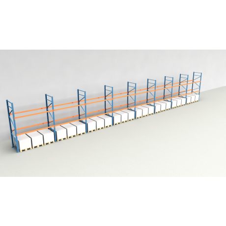 Das Palettenregal besteht aus insgesamt 8 Regalfeldern mit einer Breite von 2.700 mm und bietet Platz für 72 Europaletten (inklusive Bodenebene).