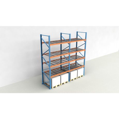 Das Palettenregal von NEDCON Lagertechnik hat Abmessungen von 5.000x3950x1.100 mm (HxBxT) und verfügt über 5 Lagerebenen. Jedes Regalfeld ist mit 4 Traversenebenen ausgestattet und kann je Ebene mit bis zu 3.800 kg (1900 kg je Europalette) belastet werden. Die maximale Feldlast beträgt 12.000 kg und darf niemals überschritten werden. Die lichte Fachhöhe zwischen den einzelnen Ebenen beträgt 900 mm. Die Palettenregal Traversenebenen sind mit Gitterböden vom Typ MantaMESH in der 750 kg Variante (je Palettenplatz) ausgestattet.