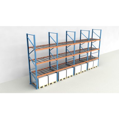 Das Palettenregal von NEDCON Lagertechnik hat Abmessungen von 5.000x7800x1.100 mm (HxBxT) und verfügt über 4 Lagerebenen. Jedes Regalfeld ist mit 3 Traversenebenen ausgestattet und kann je Ebene mit bis zu 3.800 kg (1900 kg je Europalette) belastet werden. Die maximale Feldlast beträgt 12.000 kg und darf niemals überschritten werden. Die lichte Fachhöhe zwischen den einzelnen Ebenen beträgt 1.150 mm. Die Palettenregal Traversenebenen sind mit Gitterböden vom Typ MantaMESH in der 750 kg Variante (je Palettenplatz) ausgestattet.