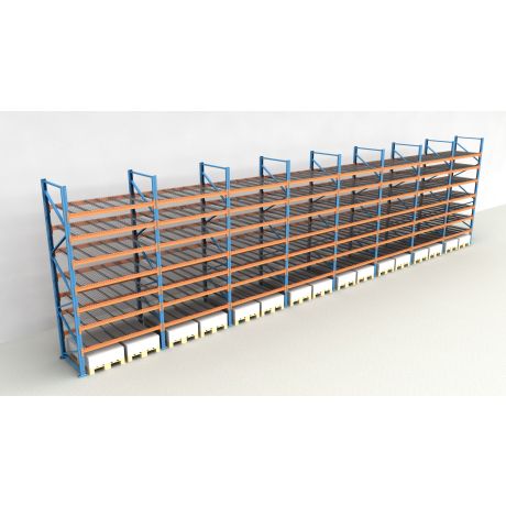 Das Palettenregal von NEDCON Lagertechnik hat Abmessungen von 5.500x15500x1.100 mm (HxBxT) und verfügt über 8 Lagerebenen. Jedes Regalfeld ist mit 7 Traversenebenen ausgestattet und kann je Ebene mit bis zu 3.800 kg (1900 kg je Europalette) belastet werden. Die maximale Feldlast beträgt 12.000 kg und darf niemals überschritten werden. Die lichte Fachhöhe zwischen den einzelnen Ebenen beträgt 600 mm. Die Palettenregal Traversenebenen sind mit Gitterböden vom Typ MantaMESH in der 750 kg Variante (je Palettenplatz) ausgestattet.