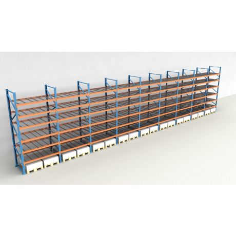 Das Palettenregal von NEDCON Lagertechnik hat Abmessungen von 5.500x17425x1.100 mm (HxBxT) und verfügt über 7 Lagerebenen. Jedes Regalfeld ist mit 6 Traversenebenen ausgestattet und kann je Ebene mit bis zu 3.000 kg (1500 kg je Europalette) belastet werden. Die maximale Feldlast beträgt 12.000 kg und darf niemals überschritten werden. Die lichte Fachhöhe zwischen den einzelnen Ebenen beträgt 700 mm. Die Palettenregal Traversenebenen sind mit Gitterböden vom Typ MantaMESH in der 750 kg Variante (je Palettenplatz) ausgestattet.