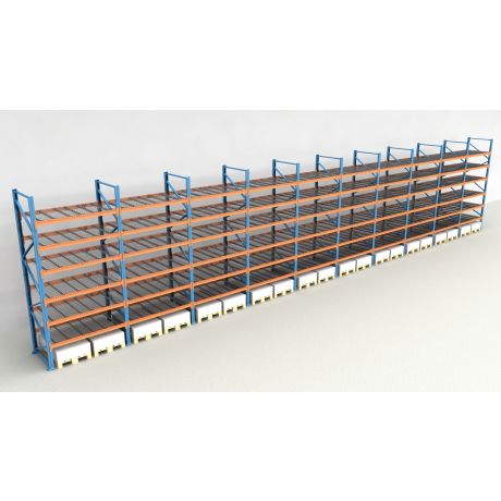 Das Palettenregal von NEDCON Lagertechnik hat Abmessungen von 6.000x19350x1.100 mm (HxBxT) und verfügt über 7 Lagerebenen. Jedes Regalfeld ist mit 6 Traversenebenen ausgestattet und kann je Ebene mit bis zu 3.000 kg (1500 kg je Europalette) belastet werden. Die maximale Feldlast beträgt 12.000 kg und darf niemals überschritten werden. Die lichte Fachhöhe zwischen den einzelnen Ebenen beträgt 750 mm. Die Palettenregal Traversenebenen sind mit Gitterböden vom Typ MantaMESH in der 750 kg Variante (je Palettenplatz) ausgestattet.