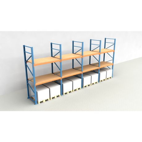 Das Palettenregal besteht aus insgesamt 4 Regalfeldern mit einer Breite von 1.825 mm und bietet Platz für 24 Europaletten (inklusive Bodenebene).