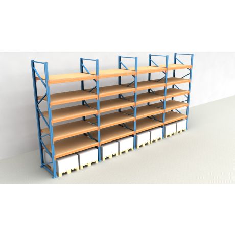 Das Palettenregal besteht aus insgesamt 4 Regalfeldern mit einer Breite von 1.825 mm und bietet Platz für 48 Europaletten (inklusive Bodenebene).
