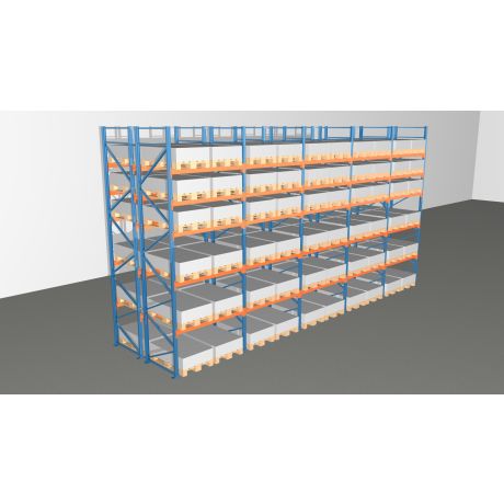 Das Palettenregal besteht aus insgesamt 2x5 Regalfeldern mit einer Breite von 1.825 mm und bietet Platz für 120 Europaletten (inklusive Bodenebene). Der Abstand zwischen beiden Regalzeilen beträgt 200 mm.