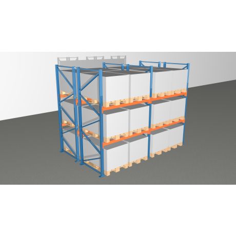 Das Palettenregal besteht aus insgesamt 2x2 Regalfeldern mit einer Breite von 1.825 mm und bietet Platz für 24 Europaletten (inklusive Bodenebene). Der Abstand zwischen beiden Regalzeilen beträgt 200 mm.