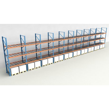 Das Palettenregal von NEDCON Lagertechnik hat Abmessungen von 7.000x19350x1.100 mm (HxBxT) und verfügt über 4 Lagerebenen. Jedes Regalfeld ist mit 3 Traversenebenen ausgestattet und kann je Ebene mit bis zu 3.000 kg (1500 kg je Europalette) belastet werden. Die maximale Feldlast beträgt 12.000 kg und darf niemals überschritten werden. Die lichte Fachhöhe zwischen den einzelnen Ebenen beträgt 1.650 mm. Die Palettenregal Traversenebenen sind mit Gitterböden vom Typ MantaMESH in der 750 kg Variante (je Palettenplatz) ausgestattet.